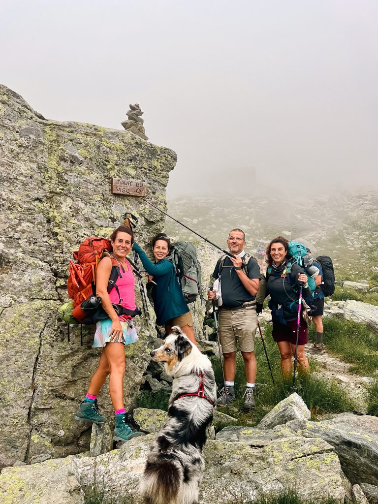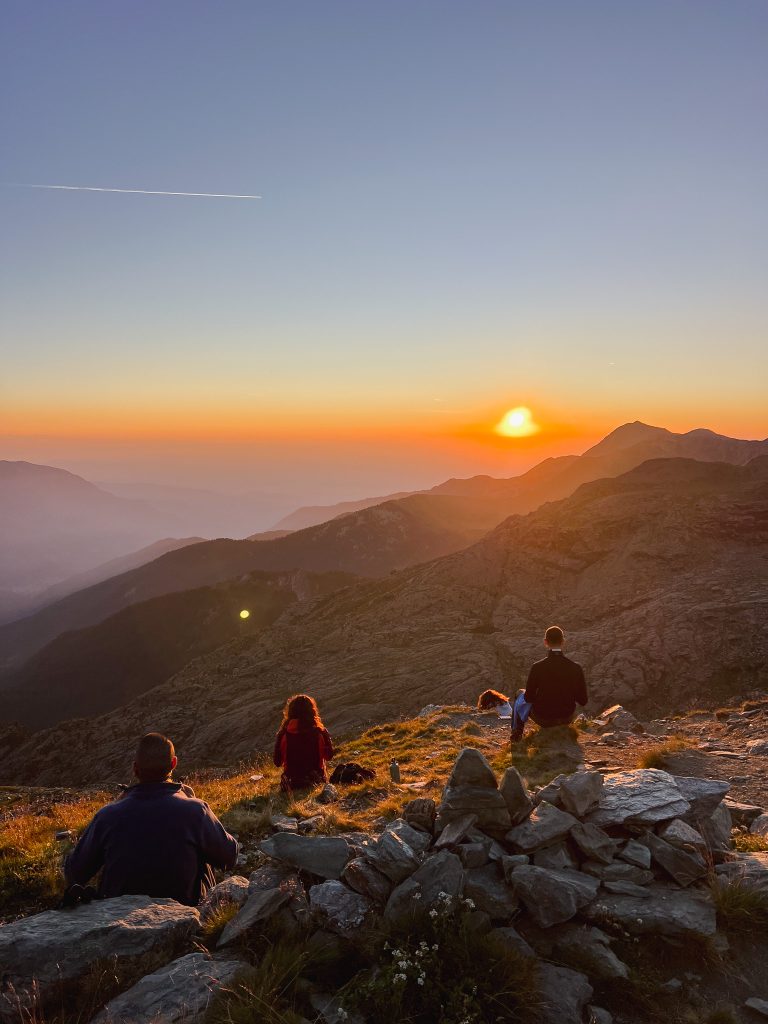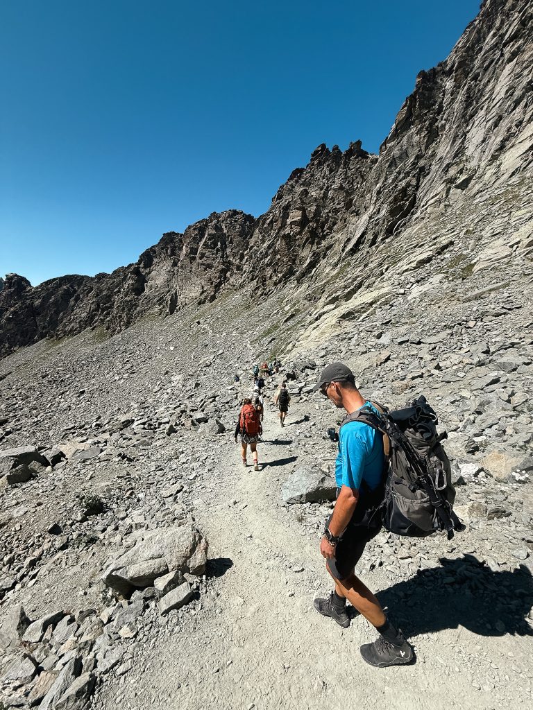 No quarto dia, para quem acordar cedo, há a possibilidade de contemplar um inesquecível nascer do sol. A seguir ao pequeno almoço, seguimos do Rifugio Giacoletti rumo ao Rifugio Granero, numa etapa desafiante. O percurso tem cerca de 10 km, com um desnível aproximado de 2157 metros, atravessando trilhos alpinos e zonas rochosas em plena alta montanha. Pelo caminho, passamos pelo mítico Buco di Viso — uma gruta escavada na rocha que liga simbolicamente Itália e França, para contornar a poderosa presença da Ponta do Monviso. A paisagem muda constantemente, revelando a beleza crua, indomável e majestosa da montanha. Apesar da exigência física, há algoprofundamente libertador neste dia: o silêncio das alturas, a vastidão das encostas e a força do grupo em movimento tornam cada passo mais consciente e significativo.
